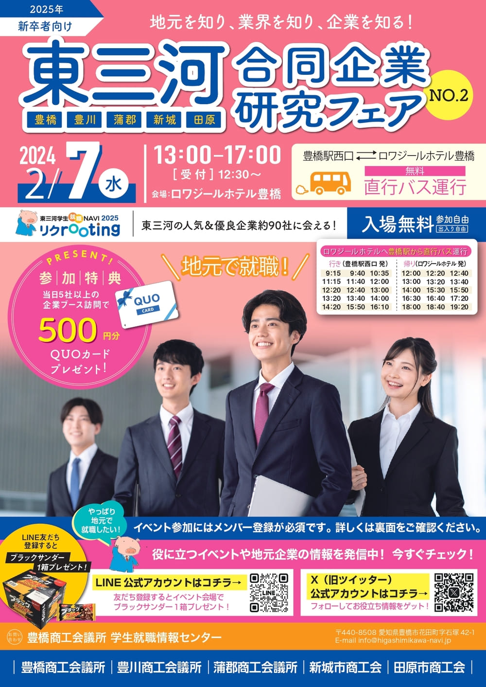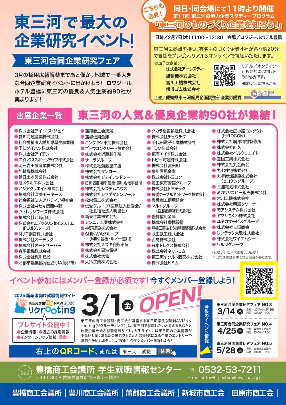 3月の採用広報解禁まであと僅か。地域で一番大きな合同企業研究イベントに出かけよう! ロワジールホテル豊橋に東三河の優良&人気企業約90社が集まります!本気の1社に出合うためにもあらかじめ出展企業をチェックして一気にまわろう!