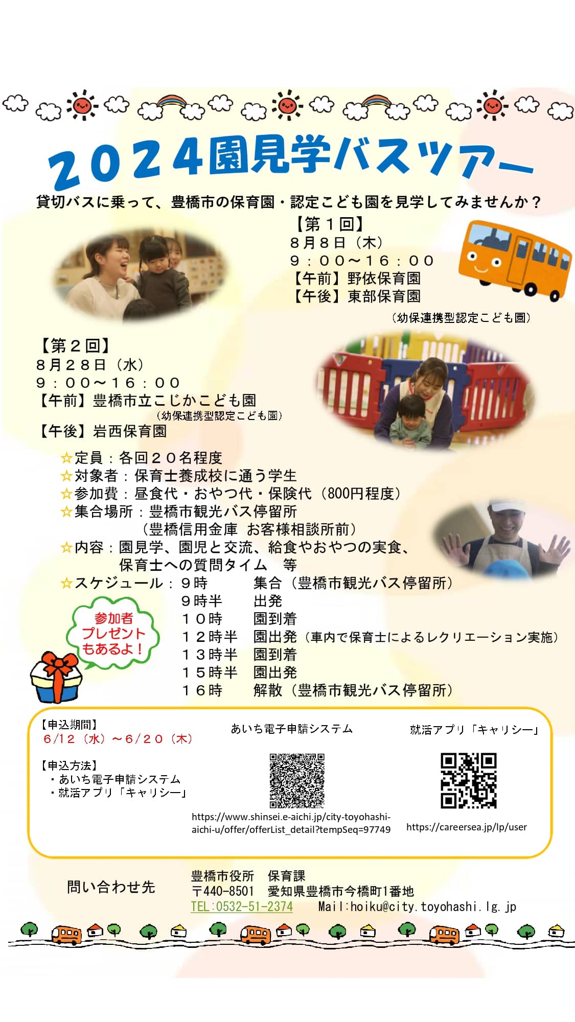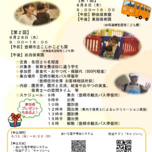 | 日程 | 【第1回】令和6年8月8日(木)9:00~16:00 見学先:①野依保育園②東部保育園(認定こども園) 【第2回】令和6年8月28日(水)9:00~16:00 |