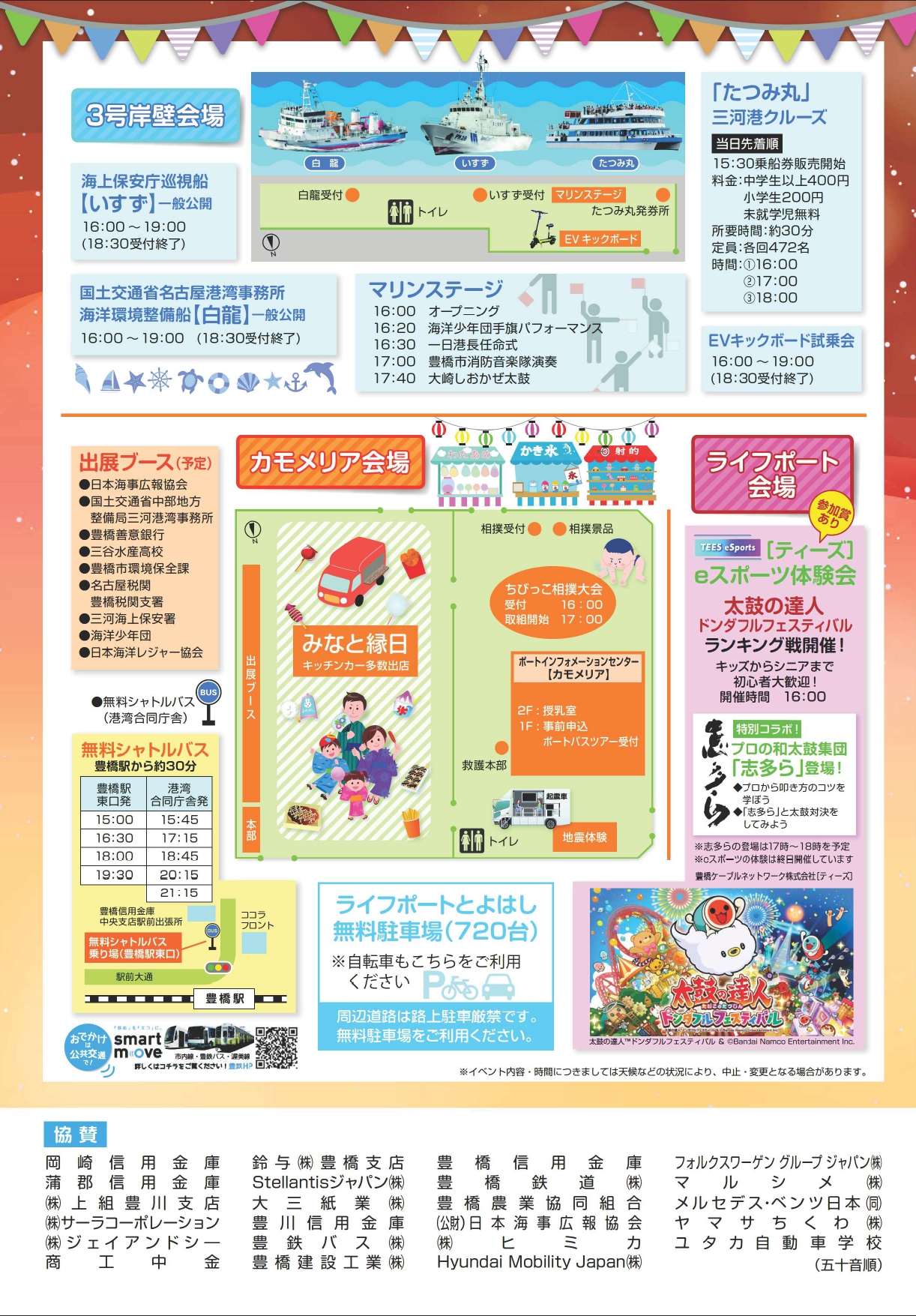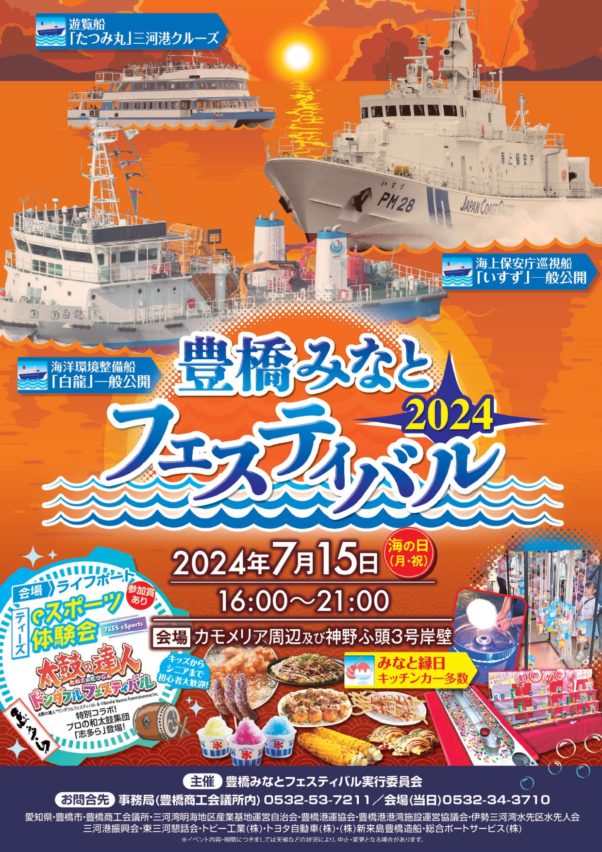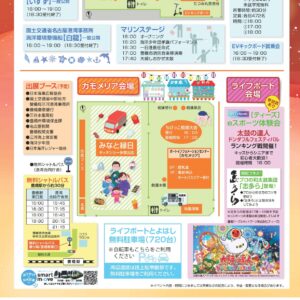 今年も、従来からの定番イベントである「海上保安庁巡視船いすずの一般公開」「遊覧船での三河港クルーズ」などに加え、国土交通省名古屋港湾事務所協力のもと海洋環境整備船「白龍」の一般公開を予定しています。ライフポート会場ではeスポーツ体験会を行い、ゲストにはプロの和太鼓集団「志多ら」が登場します。キッチンカーも昨年度より増え、射的やスーパーボールすくいなどの出店も多数あり、子どもも大人も楽しめる内容が盛りだくさんです。是非、ご家族、ご友人をお誘い合わせの上ご来場ください!