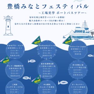 | 新来島豊橋造船 | 全長200mほどの船の造船工程の見学 | 42名/回 | 約90分 ①13:15〜14:45 ②15:00〜16:30 ③16:45〜18:15 |