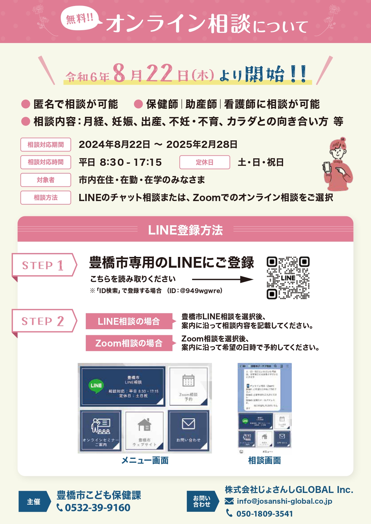 | 問合せ | 株式会社じょさんしGLOBAL Inc. TEL:050-1809-3541 E-mail:info@josanshi-global.co.jp |