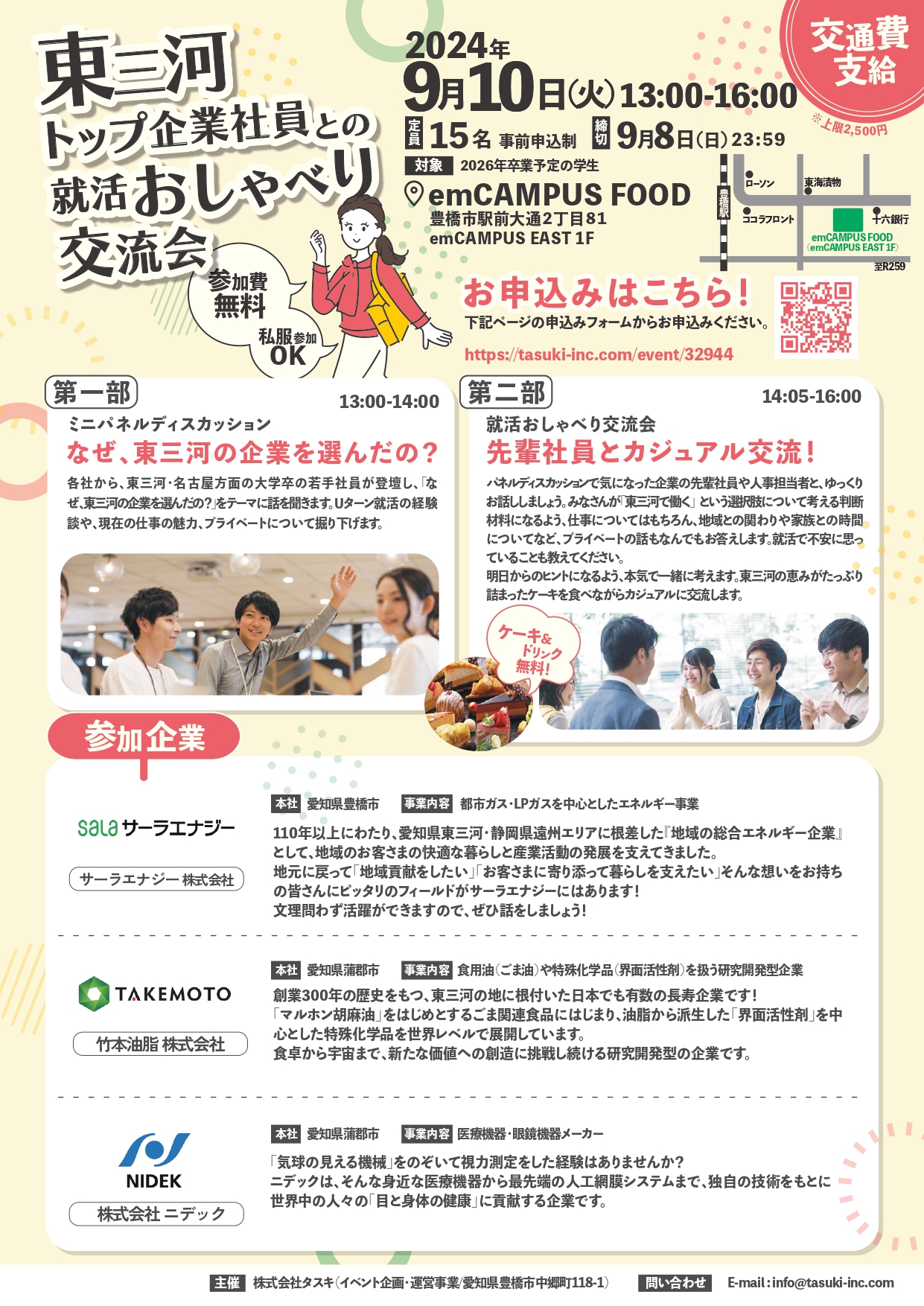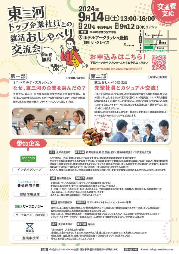 | 主催・お問い合わせ | 株式会社タスキ 担当者:中川 ✉info@tasuki-inc.com ☎0532-35-9299 |