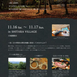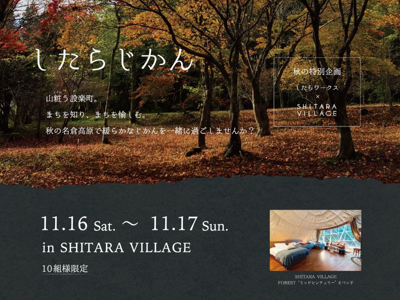 標高700m、今年8月にオープンした愛知県最大級のグランピングリゾート「シタラヴィレッジ」を会場に、地元住民との交流、ブナの森ハイキング、しめ縄作り、BBQインストラクターによる食事提供など、設楽町の魅力を感じながらゆったりとした時間をお過ごしいただく一泊二日の体験プログラムです。