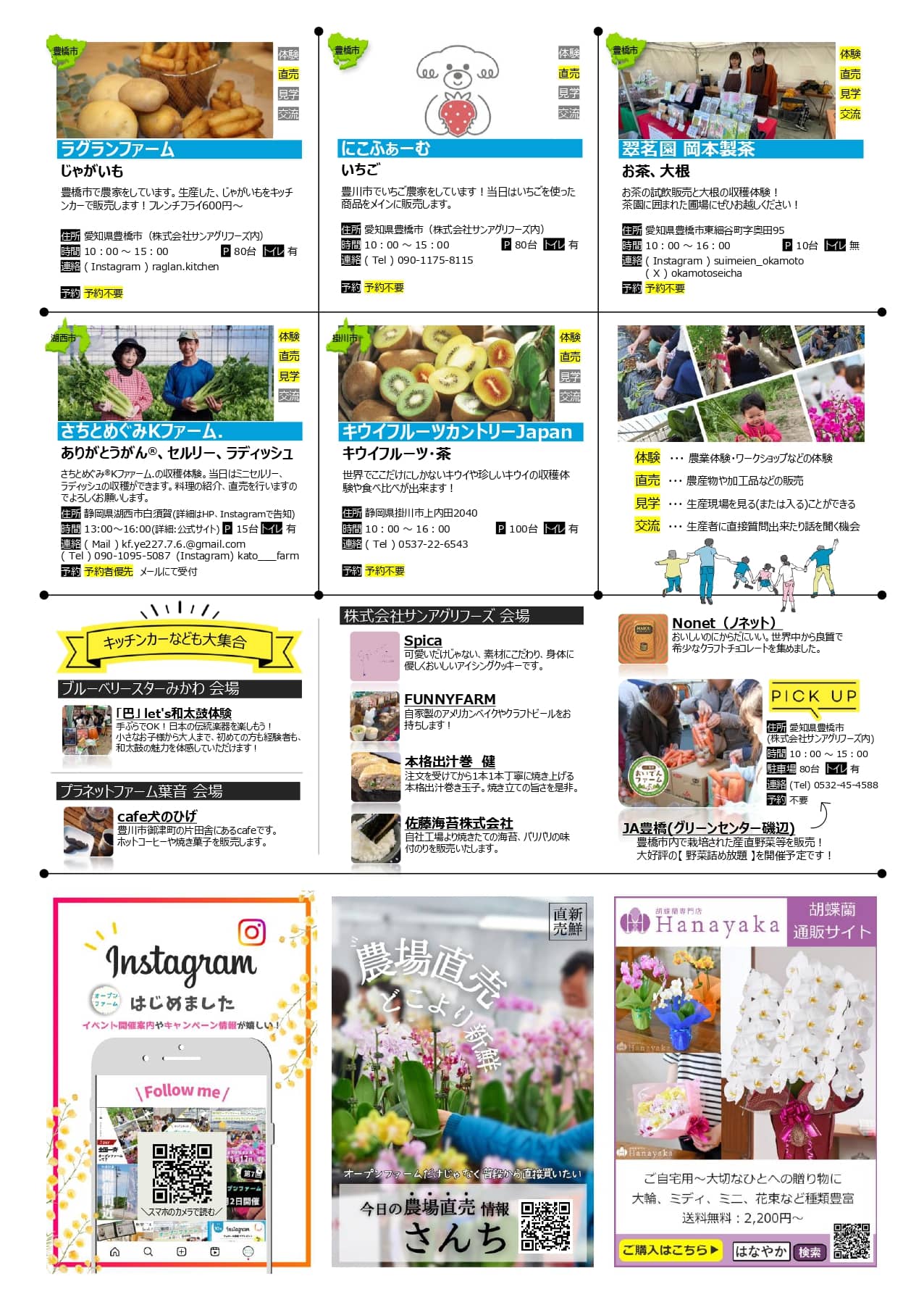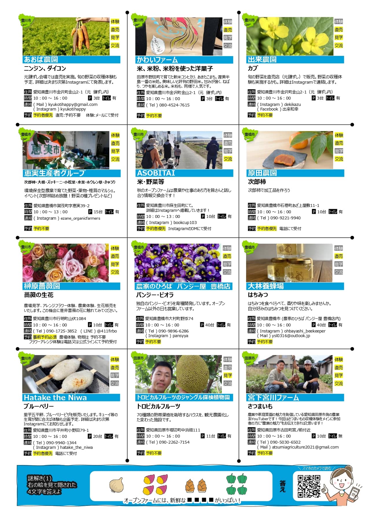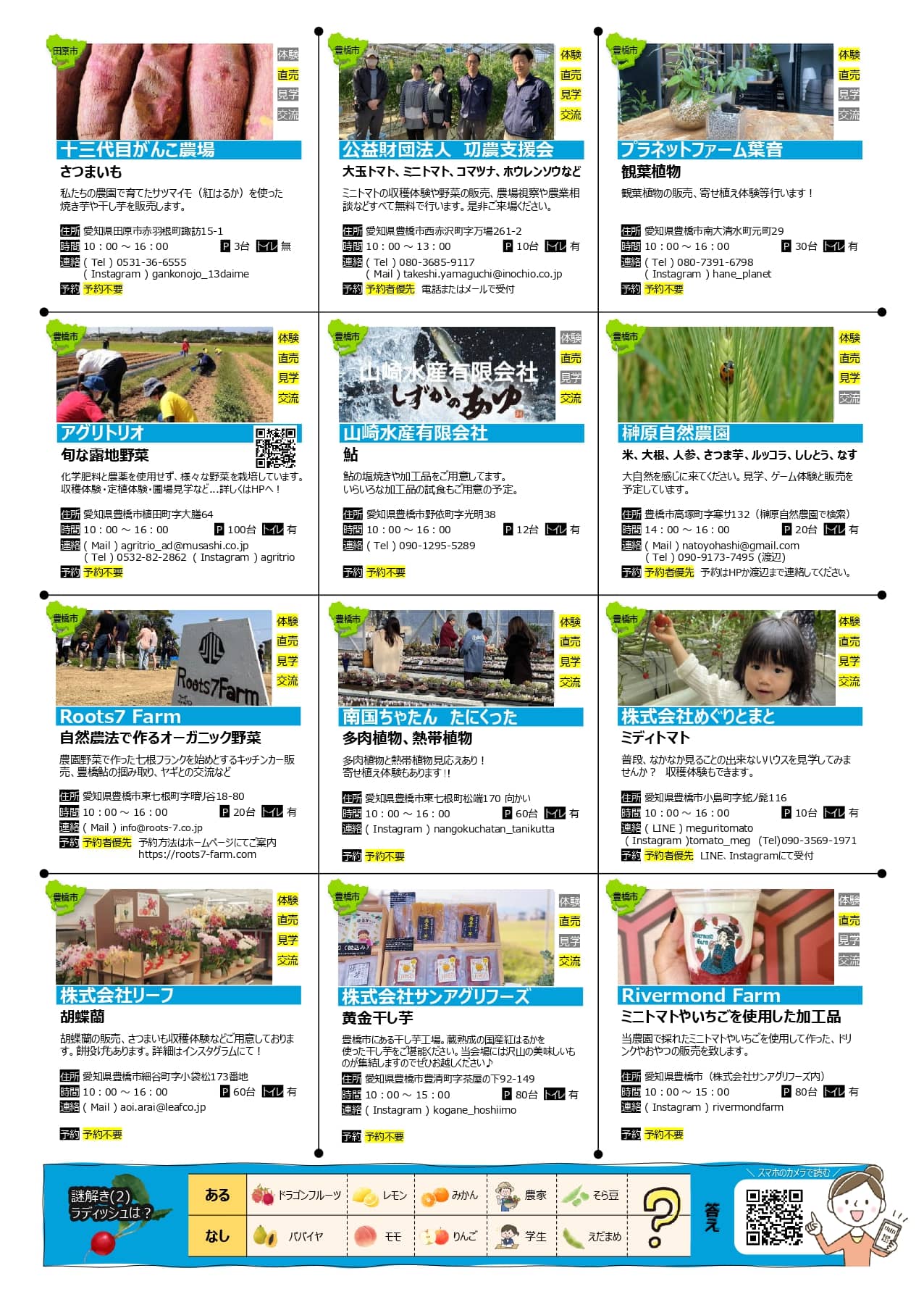 | 予約 | 事前予約が必要な農場もございます。 詳細は、チラシ・HPをご確認ください。 |
