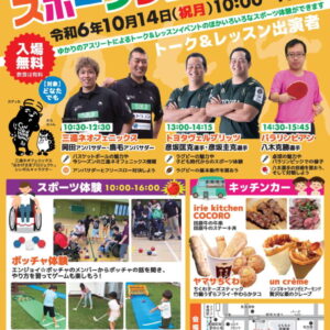 まちなかで気軽にスポーツに触れ、スポーツへの参加促進及びまちなかの活性化のため、「スポーツの日」にちなみ、今年度も株式会社豊橋まちなか活性化センターによるグルメと様々なスポーツが楽しめるイベンㇳを豊橋駅南口駅前広場で開催します。合わせて公益財団法人豊橋市スポーツ協会による豊橋ゆかりのアスリートのトーク&レッスンやスポーツ体験等を豊橋市まちなか広場にて開催し、両会場をつなぐスタンプラリーも実施します。