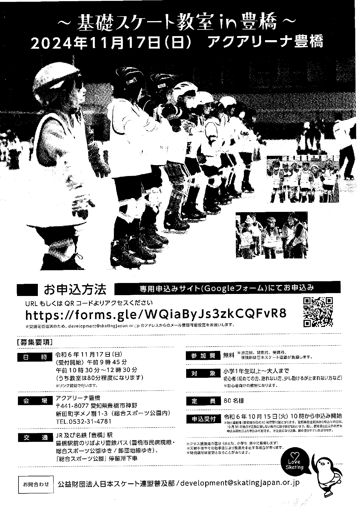 | お問い合わせ | 公益財団法人日本スケート連盟普及部 MAIL:development@skatingjapan.or.jp |