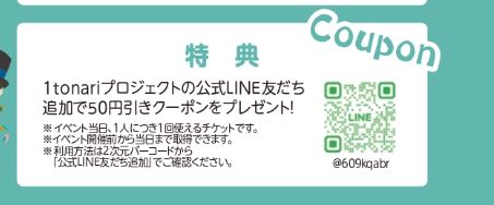 チラシに掲載していた公式LINEがアカウントが管理者側の都合で削除されしまったため、新しいアカウントを掲載いたしました。別途、一般参加者の方にはInstagram広告でも上記についてお詫びをさせていただきます。当日会場で紙クーポンを配布する予定です。