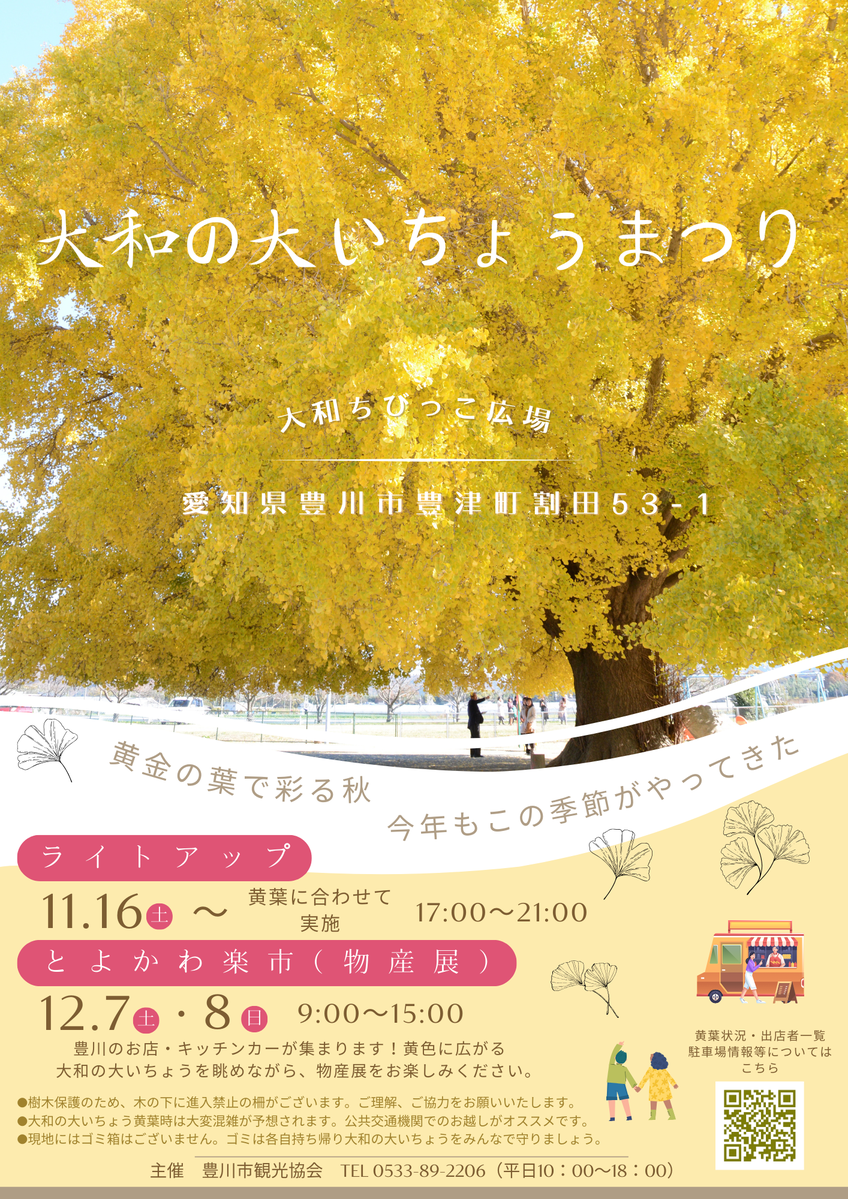 みなさん、豊川市豊津町の大和ちびっこ広場にある「大和の大いちょう」を知っていますか?この大イチョウは、高さ約25㍍、樹冠幅は約30㍍という、とっても大きな雄(おす)の木です。