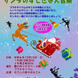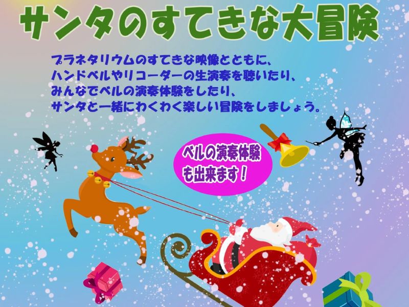 プラネタリウムのすてきな映像とともにハンドベルやリコーダーの生演奏を聴いたり、みんなでベルの演奏体験をしたり、サンタと一緒にわくわく楽しい冒険をしましょう!