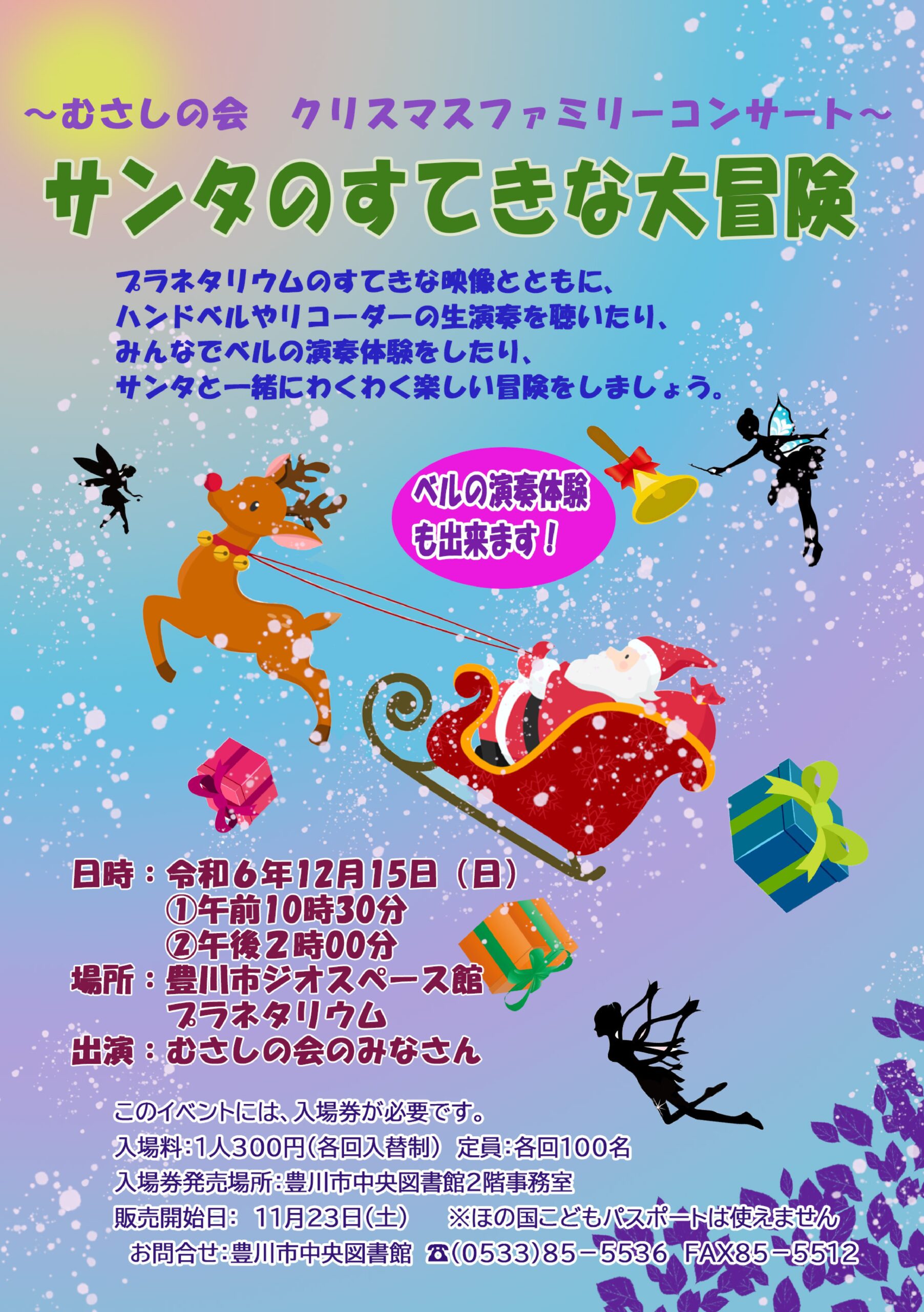 プラネタリウムのすてきな映像とともにハンドベルやリコーダーの生演奏を聴いたり、みんなでベルの演奏体験をしたり、サンタと一緒にわくわく楽しい冒険をしましょう!