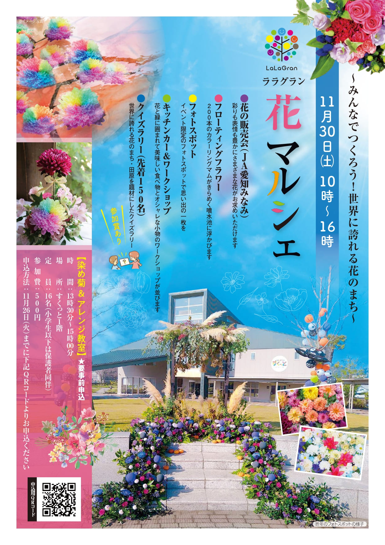 キッチンカー、テナントやテントにて花や雑貨の販売、ワークショップ、フローティングフラワーやフォトスポットの設置、クイズラリー、染め菊&アレンジ教室(要事前申込)など。