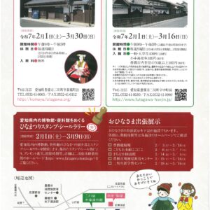 愛知県内の博物館・資料館など34施設のひなまつり展示を巡るスタンプ・シールラリーです。集めたスタンプ・シールの数により景品をプレゼントします。