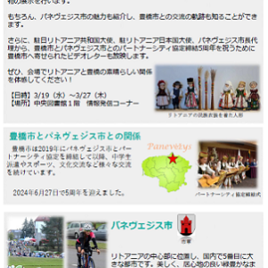 また、駐日リトアニア共和国大使、駐リトアニア日本国大使、パネヴェジス市長代理から、豊橋市へ寄せられたお祝いのビデオレターも放映します。