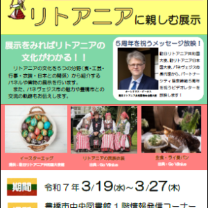 豊橋市とリトアニア・パネヴェジス市のパートナーシティ協定締結5周年を記念し、参加者が講師と一緒にリトアニア語で詩を朗読しながら、その背景にあるリトアニアの歴史や文化を学ぶ朗読体験会と、リトアニアの文化を紹介する展示を中央図書館で開催します。