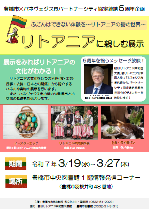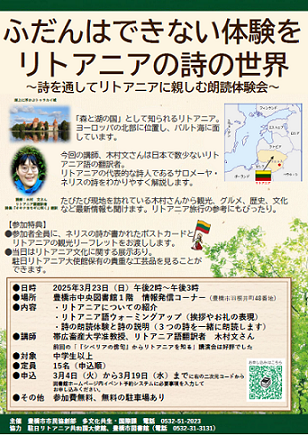 豊橋市とリトアニア・パネヴェジス市のパートナーシティ協定締結5周年を記念し、参加者が講師と一緒にリトアニア語で詩を朗読しながら、その背景にあるリトアニアの歴史や文化を学ぶ朗読体験会と、リトアニアの文化を紹介する展示を中央図書館で開催します。