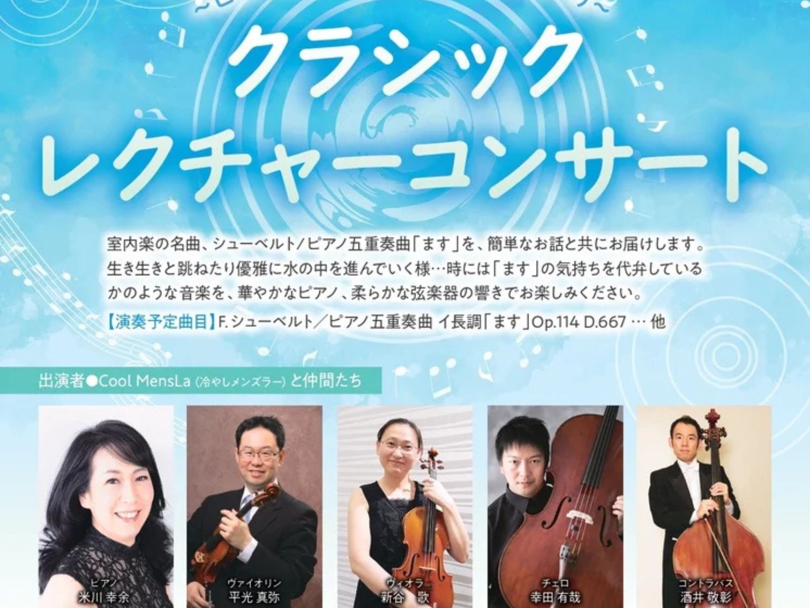 Cool MensLaと仲間たち[米川幸余(ピアノ)、平光真弥(ヴァイオリン)、新谷歌(ヴィオラ)、幸田有哉(チェロ)、酒井敬彰(コントラバス)]