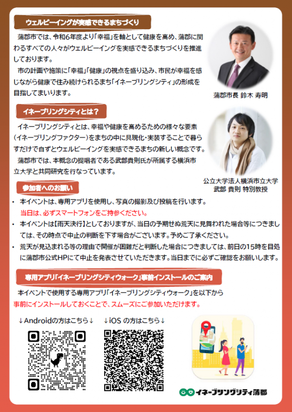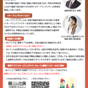 まちのみどりや道端の自然が持つ「幸せや健康」につながる要素を探すイベントです。専用アプリを使い、まちで見つけたみどりや自然に関わるものを撮影、投稿します。みなさまと集めたデータは幸福で健康なまちづくりに活用していきます。