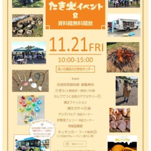 たき火(土器焼きなど)、縄文ガチャ、縄文ファッション体験コーナー、セルフ貝のアクセサリーづくり、伊勢湾フェリー特設コーナー、サンテパルクたはら特設コーナー、移動図書館、キッチンカー(フード販売)など