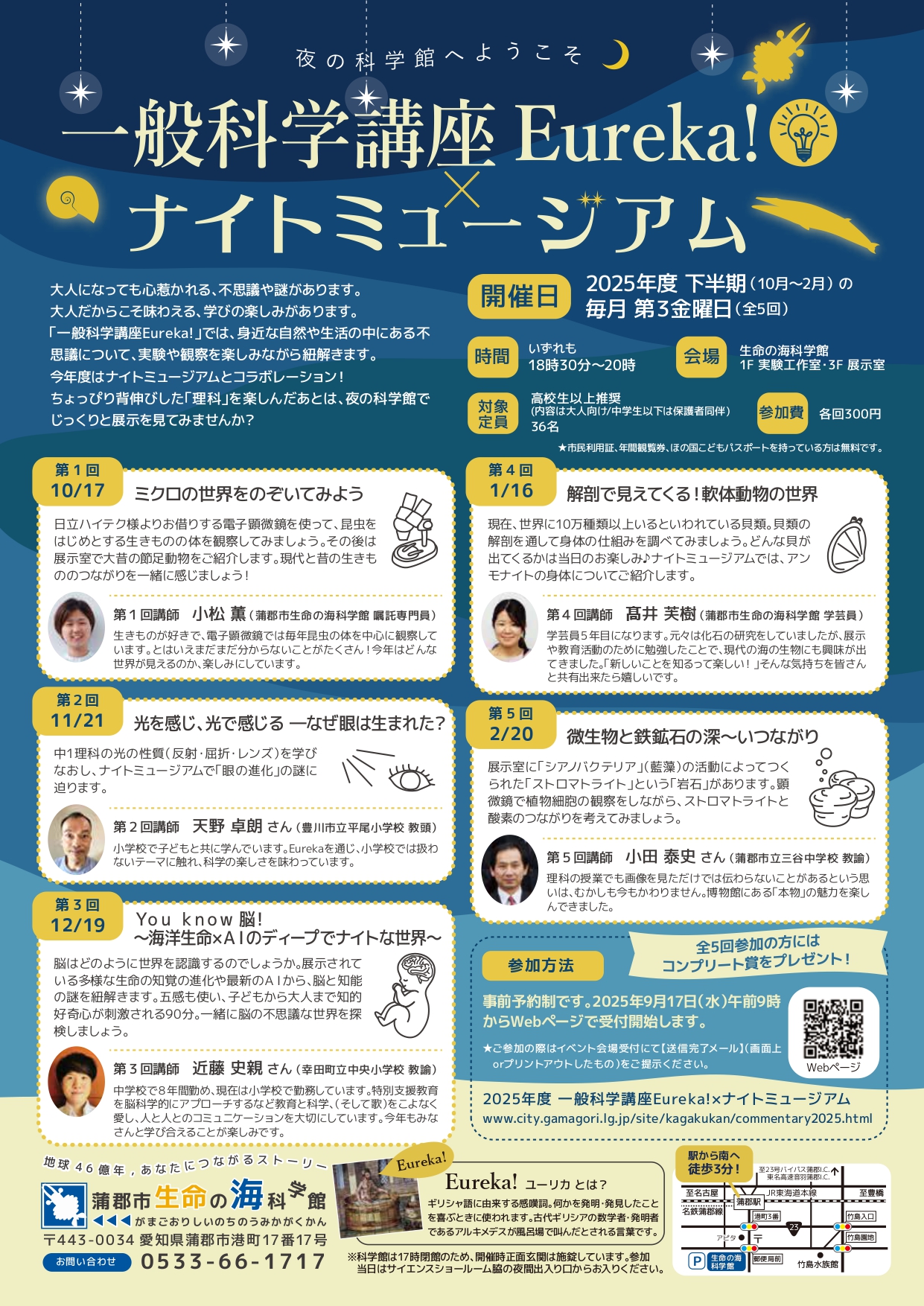 「一般科学講座Eureka!」では、身近な自然や生活の中にある不思議について、 実験や観察を楽しみながら紐解きます。