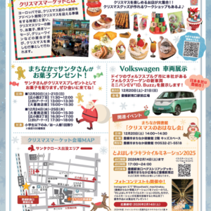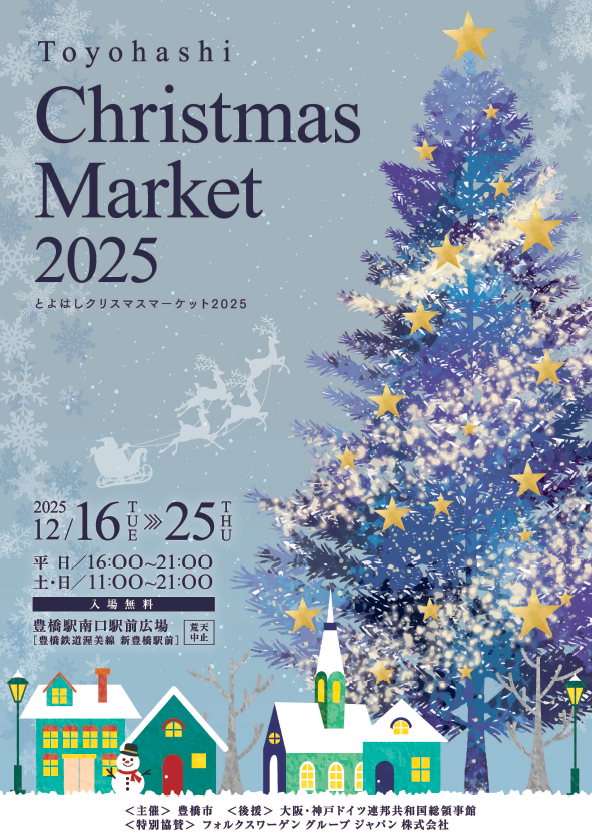 イルミネーションがきらめく豊橋のまちなかで、本場ドイツの雰囲気をイメージしたクリスマスマーケットを今年も開催します。「とよはしクリスマスマーケット」はドイツのヴォルフスブルグ市との交流を契機に平成27年から始まり、11回目となります。