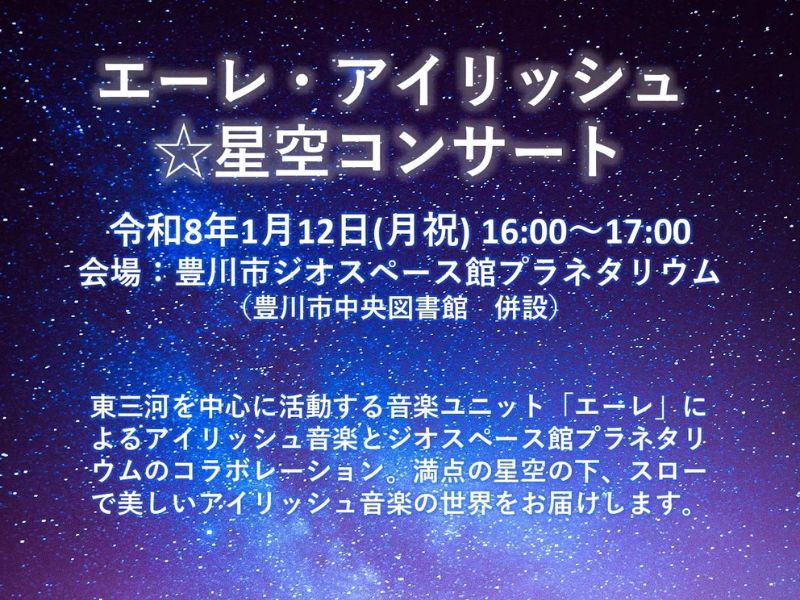 豊川市ジオスペース館では、次のとおり「エーレ・アイリッシュ☆星空コンサート」を開催します。