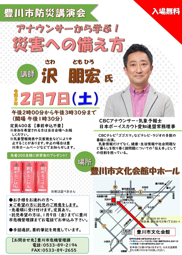 豊川市では、市民の防災意識向上を目的として、防災講演会を開催します。