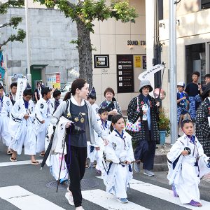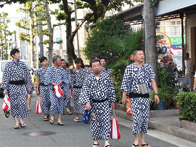 一番最後に歩いている上伝馬町の皆さんが饅頭を配布してくれます。