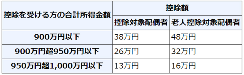 平成30年分以後の控除額は、控除を受ける旦那さんの合計所得金額、及び控除対象配偶者となる奥さんの年齢により次の表のとおりになります。