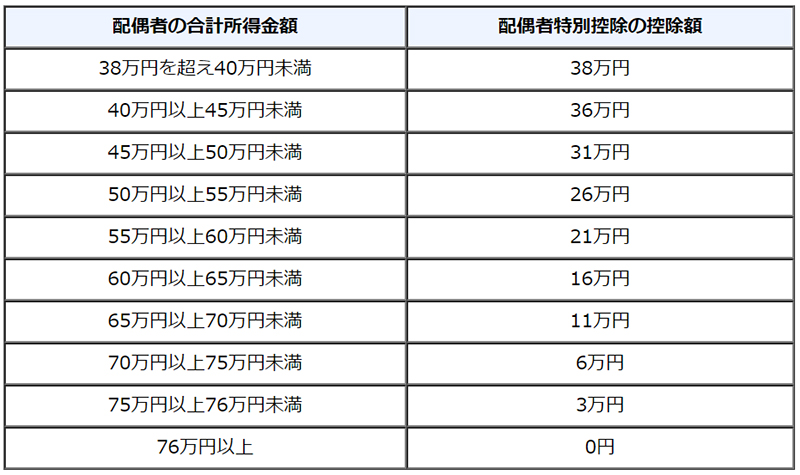 平成30年分以後、配偶者特別控除による控除額は、控除を受ける納税者本人のその年における合計所得金額、及び配偶者の合計所得金額それぞれに応じて次の表のようになります。
