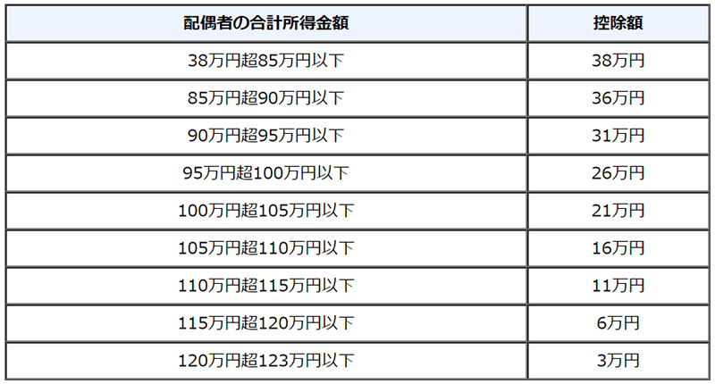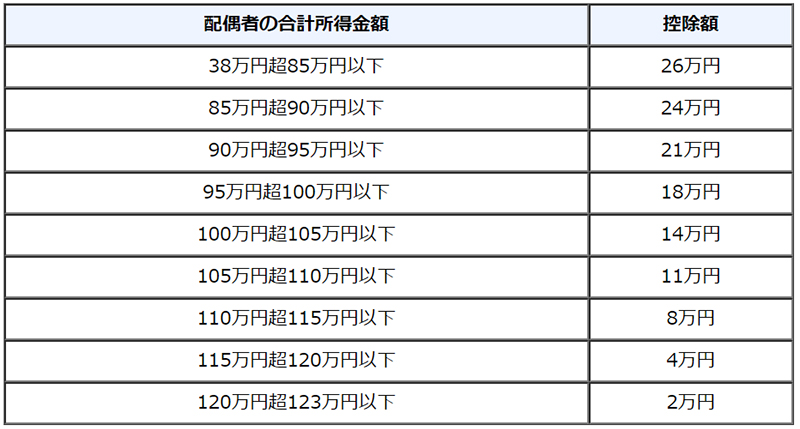 配偶者に合計所得金額が38万円(給与収入103万円)を超える所得があるため配偶者控除の適用が受けられないときでも、配偶者の所得金額に応じて、旦那さんが一定の金額の所得控除を受けられる場合があります。