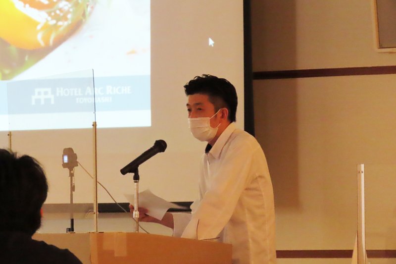 商品開発支援のメインコーディネーターとして講話に登壇されたのはホテルアークリッシュ豊橋 総料理長の 今里 武 氏。今里氏はホテルアークリッシュでの料理に対する考え方、OEM商品・外部販売商品の考え方を紹介。