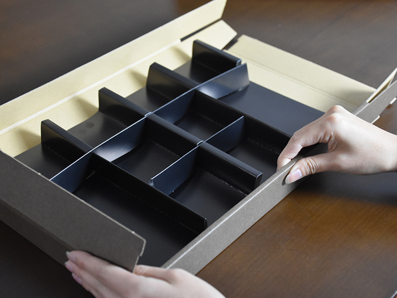 貼箱及びダンボール製品を中心に梱包用品を幅広く扱い、本社内には貼箱部門とダンボール製品の生産設備を揃え、お客様のニーズに対応します。また、包装資材に関する豊富な知識によって、お客様の希望に答えるだけでなく、製品をより一層高める、価値ある包装資材のデザインを提案し、安定的に製品をお届けしています。