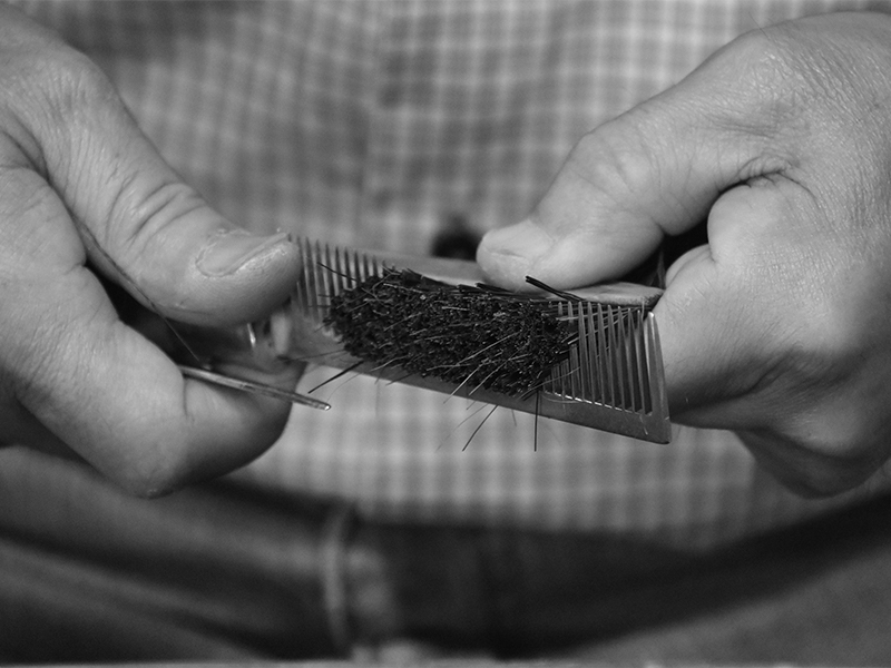 36の工程を経て出来上がる豊橋筆。その書き心地は、作業工程の一つ一つに費やされるこだわりによって出来上がります。一度も切られていないバージンヘアーのみを職人の手で選別し、長さの異なる毛を均一になるまで根気よく混ぜ合わせながら、最高の筆作りを行っています。