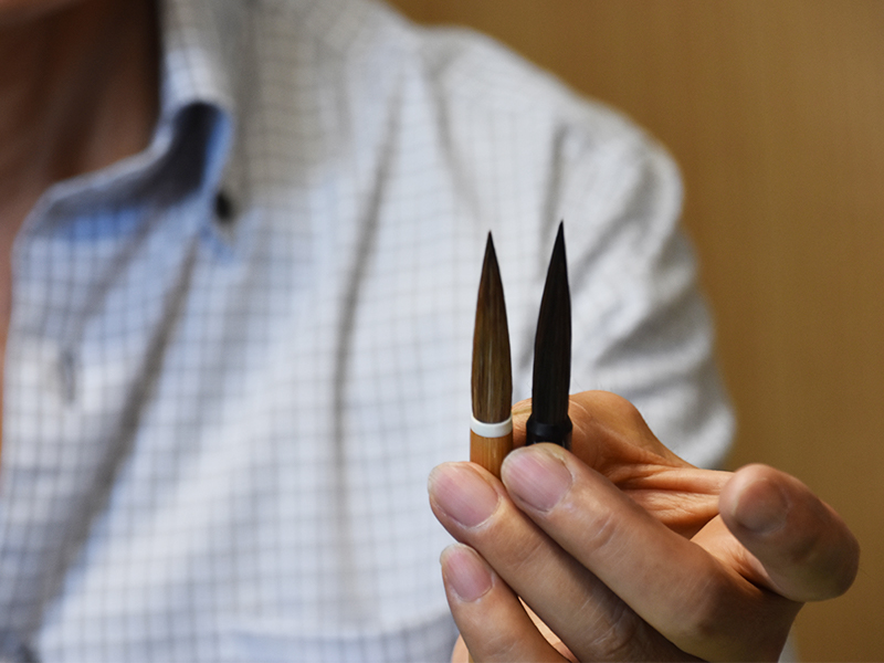 筆作りを追い求め続けるだけでなく、自身も書道を習い、筆を手に取ることによって使う人の気持ちを考えながら筆作りに取り組んでいると語って下さった。また、自身の筆の作品も作品展に出展し、使い手となる方々との対話の機会を設け、そこで集めた声を筆作りに反映させている。