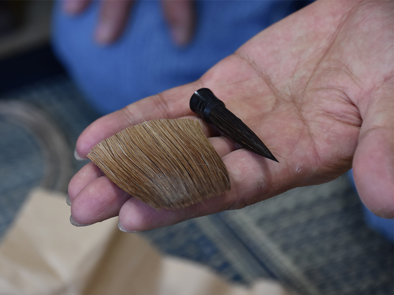 筆作りを追い求め続けるだけでなく、自身も書道を習い、筆を手に取ることによって使う人の気持ちを考えながら筆作りに取り組んでいると語って下さった。また、自身の筆の作品も作品展に出展し、使い手となる方々との対話の機会を設け、そこで集めた声を筆作りに反映させている。