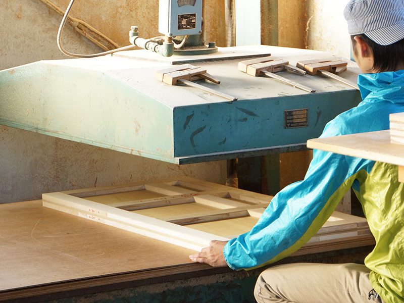 当社では、この道一筋のベテラン職人の技術により、良質な木材の中でも用途に合った木の部位を製品にあてがうことができます。同じ一本の木でも柔らかさや節の有無など様々な特徴を見極めたうえで木材を建具材へと加工し、建具と共に暮らす人々の生活を守るお手伝いをしています。