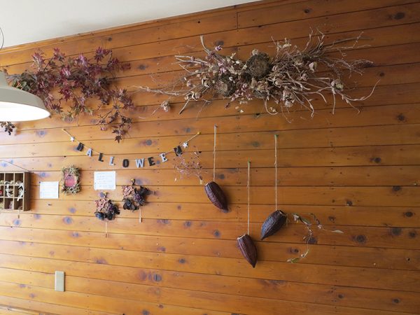 ハロウィンの季節ということで、先日の記事で紹介した綾野さんの布花が飾られているが、11月になるとまた次の作家さんにバトンタッチして、また違った模様が描かれる。年明けも予約がすでに入っているとの事。