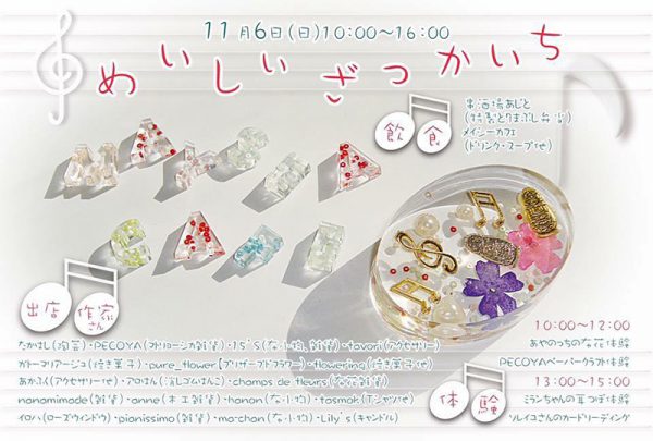 それから、年に2回「めいしぃ雑貨市」という雑貨市を開いており、近くでは11月6日の日曜日に開かれる。20人以上の作家さんの雑貨が並ぶだけでなく、美味しいお弁当やスープの販売やワークショップも開催される。
