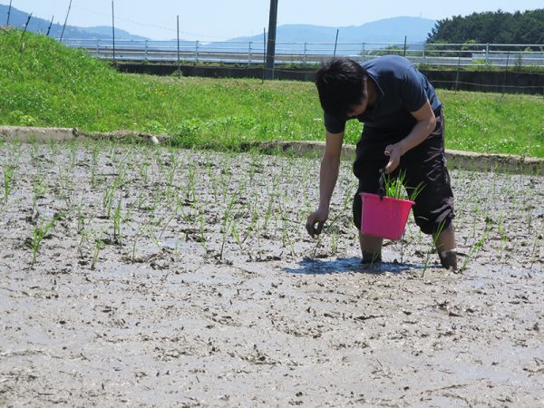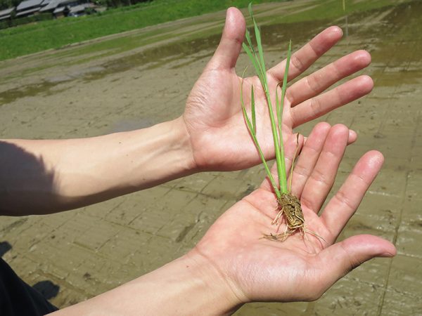 米ぬかを撒くことによって田んぼに差し込む日の光が遮られ、雑草を生えなくする効果があるそうだ。