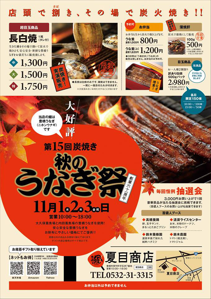 夏目商店の「第15回炭焼き秋のうなぎ祭」は11月1・2・3日の3日間10:00から18:00まで行われているので、まだ食べていない人は、是非ご訪問ください。