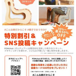 そんなPOMchairはこんな時だからこそ、親子でおうちDIYを応援!新型コロナウイルスの影響で外出できないお子さんと一緒に椅子づくりが楽しめるよう、POMchairを特別割引価格で販売しています。