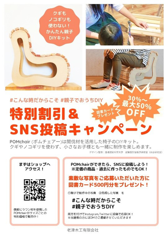 TwitterもしくはInstagramから「親子で作る様子の写真」と「完成したPOMchairの写真」をキャンペーンハッシュタグ「#こんな時だからこそ」と「#親子でおうちDIY」を付けて投稿ください。応募は2020年5月5日(火)までです。