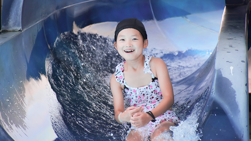 ウォータースライダーに流れるプール、さらには波のプールまで、お子さまが笑顔になること間違いなし!の安心・安全なプールです。