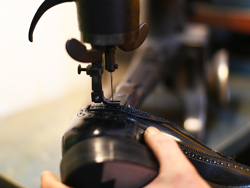 ソールの張替や、縫い目のほつれの修理依頼が多くあるが、例えば縫い目のほつれの修理の場合、当初の縫い目に針を合わせ、100年以上前の手回しミシンで正確に縫い合わせていく。