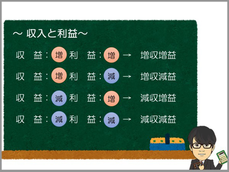 収益が増えたとしても、それ以上に費用が増えてしまえば利益は減り、「増収減益」となります。