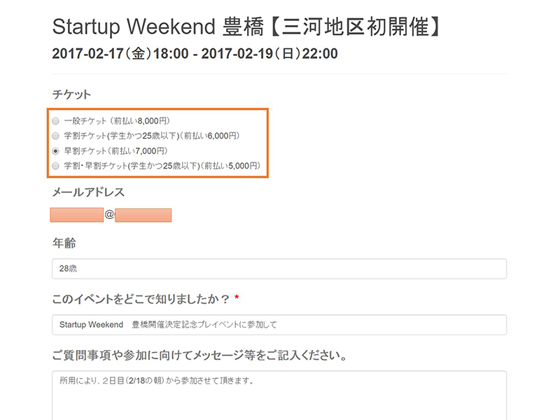 年齢とドコでイベントを知ったのか、そしてメッセージを記載します。