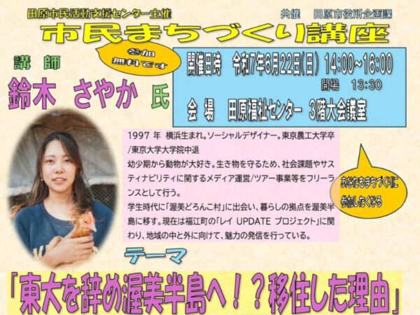 渥美どろんこ村や株式会社あつみ編集舎などで活動している鈴木さやか氏から、「渥美半島のまちづくり」について紹介いただきます。 事前申し込み不要、参加費は無料です。 ▽詳しくはこちら・イベントチラシ クリックで…