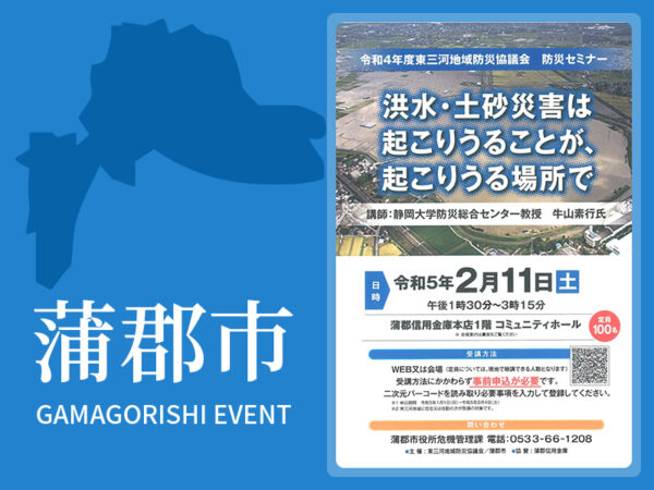 令和4年度東三河地域防災協議会主催の防災セミナーを下記のとおり開催します。 講師:静岡大学防災総合センター教授 牛山素行 氏 ※要事前申込み・申込期間2023年1月1日(日)~2023年2月4日(土) ▽詳しくはこちら・…