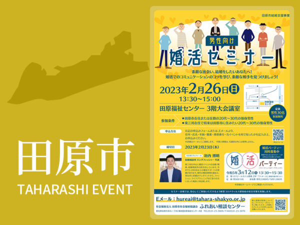 婚活のコツを分かりやすくお伝えします。これからの婚活に役立つ、婚活でのコミュニケーションのコツを学び、素敵な相手を見つけましょう! 開催日 2023年2月26日(日)13:30~15:00 場所 田原福祉センター・3階大…