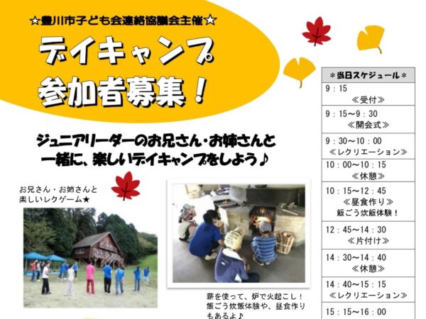 豊川市子ども会連絡協議会<ジュニアリーダーズクラブ>では、豊川市内の小学4年生から6年生の子ども会員を対象に、『デイキャンプ』を開催します!当日は、中・高校生のジュニアリーダーのお兄さん・お姉さんと一緒に、楽しい「レクリ…